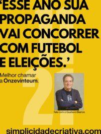 Aproveitando o contexto desse ano, o terceiro conceito da campanha avisa que “Esse ano sua propaganda vai concorrer com futebol e eleições”. A resposta em todos os casos é “melhor chamar a Onzevinteum”.